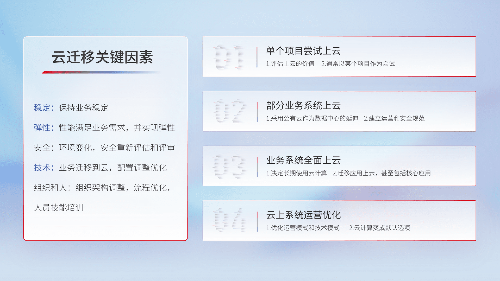 结合实际业务,,,,从规划设计、、云平台选型、、、、云原生改造、、、数据迁移、、集成交付,,,迁移全过程为客户识别最佳上云路径,,,,做好风险识别管理,,设计网络架构、、身份权限、、安全审计合规、、、操作审计、、日志审计、、、监控告警策略、、多站点容灾设计等,,对云上基础设施进行整体规划,,,提升IT治理水平,,,以满足弹性、、、、高可用、、高性能的需求。。。。